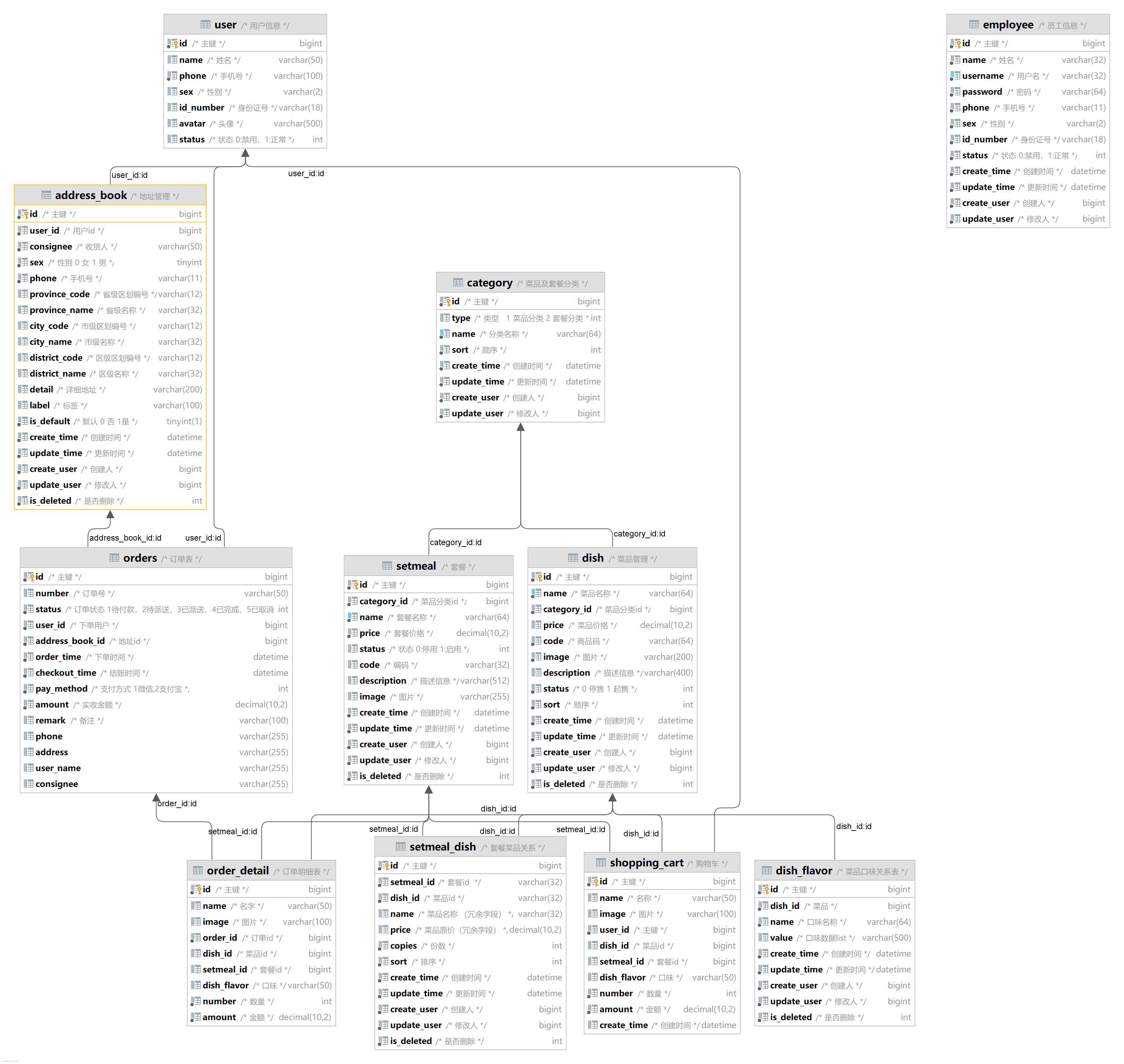 表来维系,一个订单可能包括多个内容(即菜品或套餐),这些内容由order_detail表来维系,order表则记录
